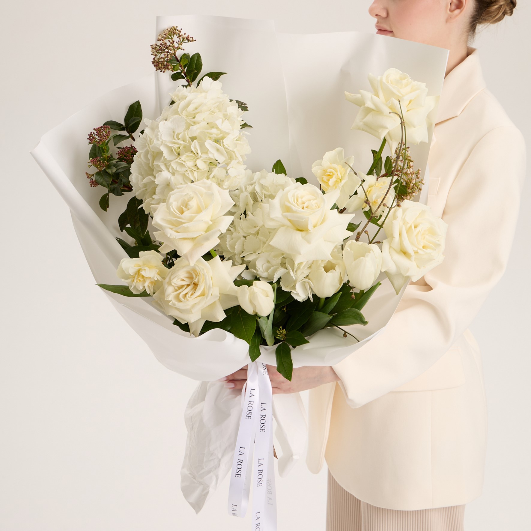 Свежие цветы от La Rose доставляются в фирменной коробке и вазе. Переставьте букет из аквабокса в вазу с водой, предварительно подрезав стебли под углом. Меняйте воду ежедневно, обновляя срез. На 2-3-й день можете добавить наш порошок. Используйте холодную воду и добавляйте лёд для лучшего эффекта. Держите цветы вдали от отопителей, солнца и фруктов — они вредят растениям.