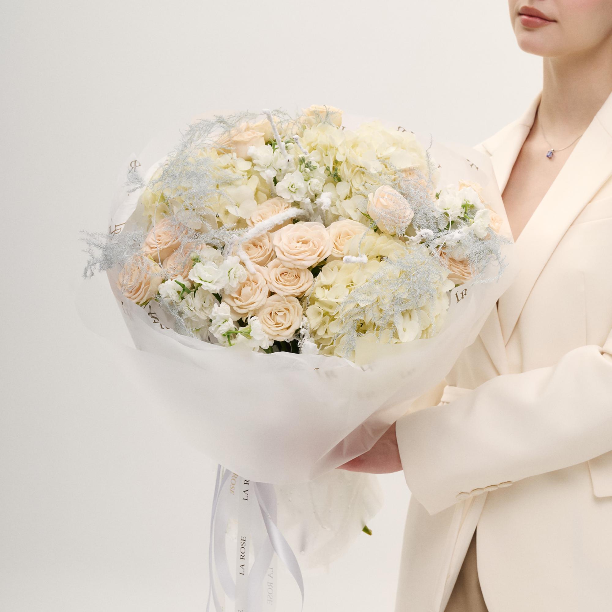Нежный букет с кустовыми розами и гортензиями