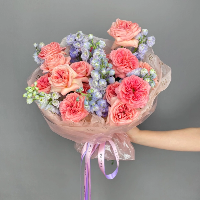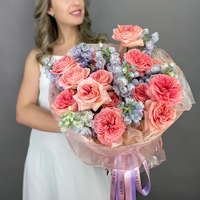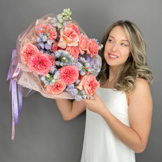 Букет сочетает розовые пионовидные розы и фиолетовые дельфиниумы. Композиция отличается контрастом форм: округлые полные бутоны пионовидной розы дополняются вертикальными соцветиями дельфиниумов. Цветовая гамма объединяет нежный розовый и глубокий фиолетовый оттенки. Такое сочетание подходит для выражения самых нежных чувств, демонстрации зарождающихся отношений и в качестве подарка для ценителей необычных цветочных композиций.