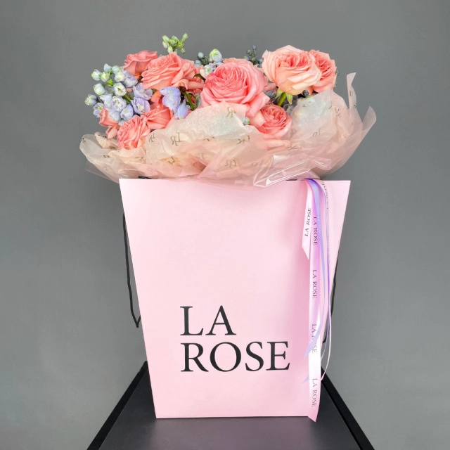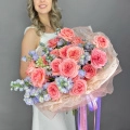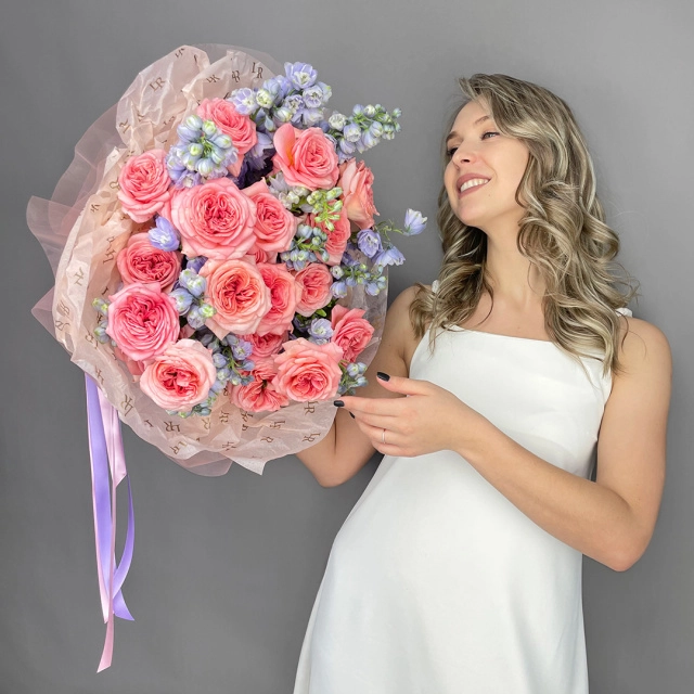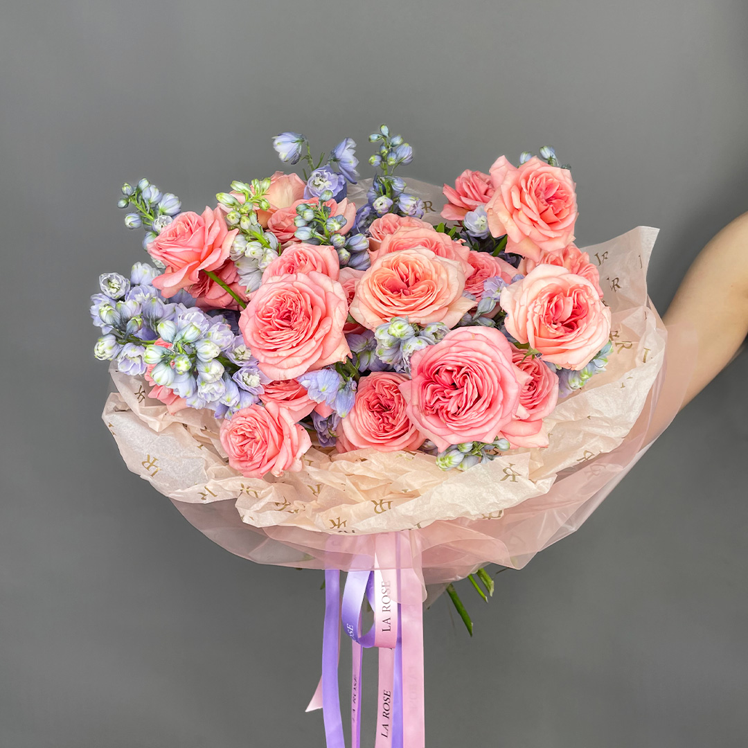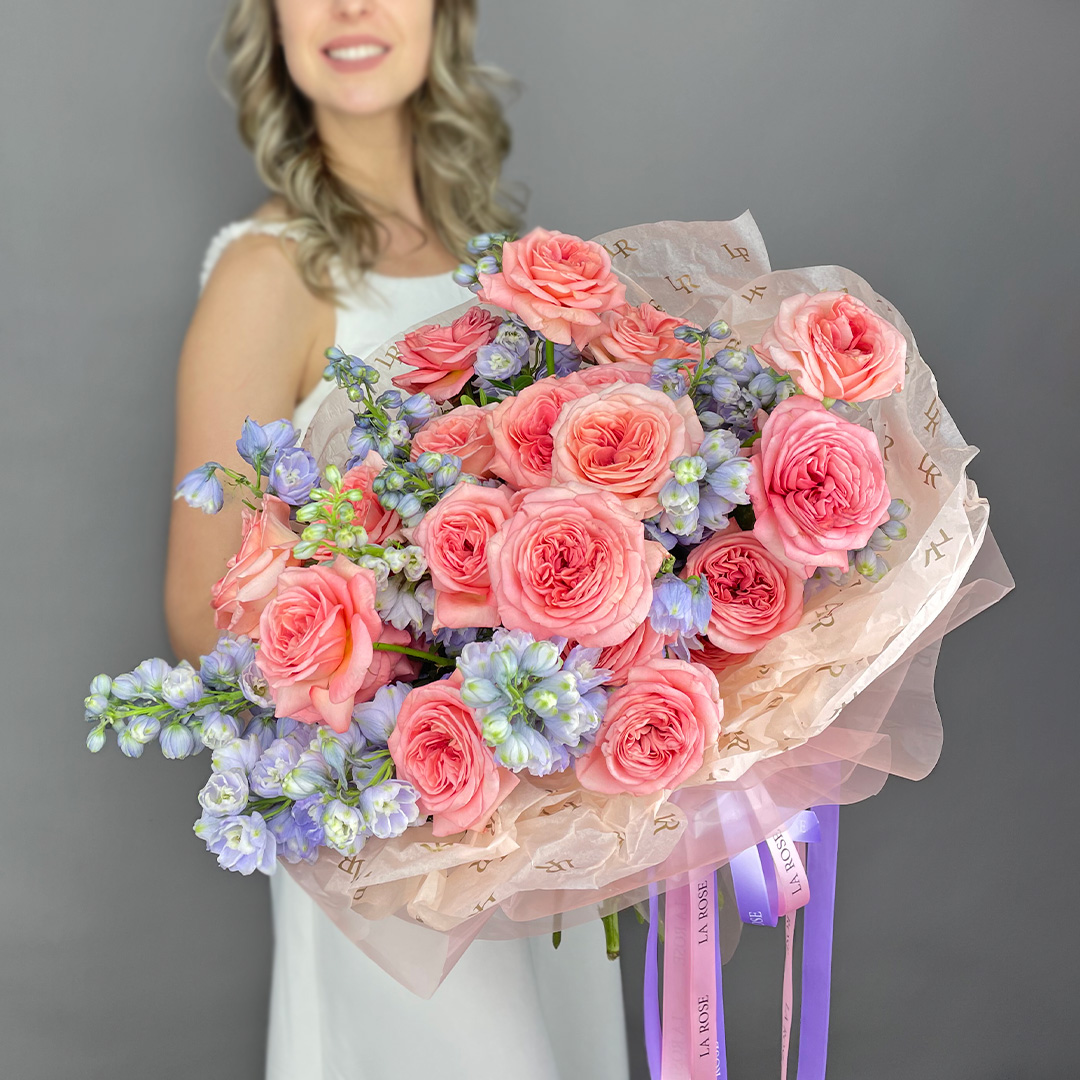 Букет сочетает розовые пионовидные розы и фиолетовые дельфиниумы. Композиция отличается контрастом форм: округлые полные бутоны пионовидной розы дополняются вертикальными соцветиями дельфиниумов. Цветовая гамма объединяет нежный розовый и глубокий фиолетовый оттенки. Такое сочетание подходит для выражения самых нежных чувств, демонстрации зарождающихся отношений и в качестве подарка для ценителей необычных цветочных композиций.