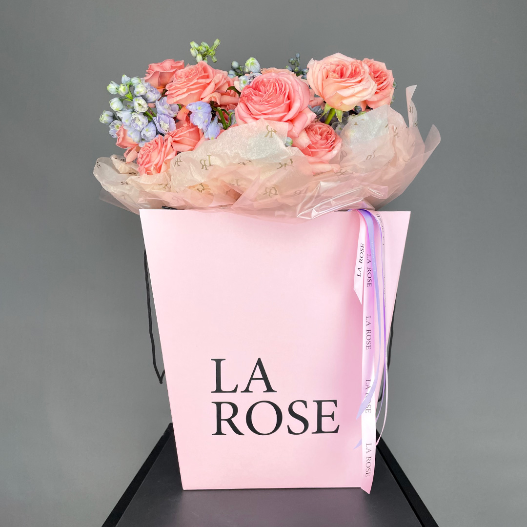 Роза одиночная пионовидная, дельфиниум, бумага тишью La Rose, пленка прозрачная с оттенком, лета атласная La Rose.
