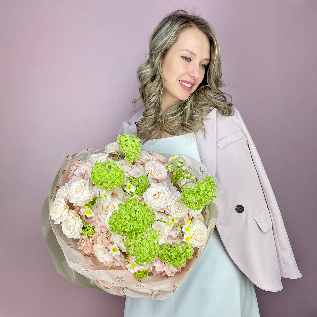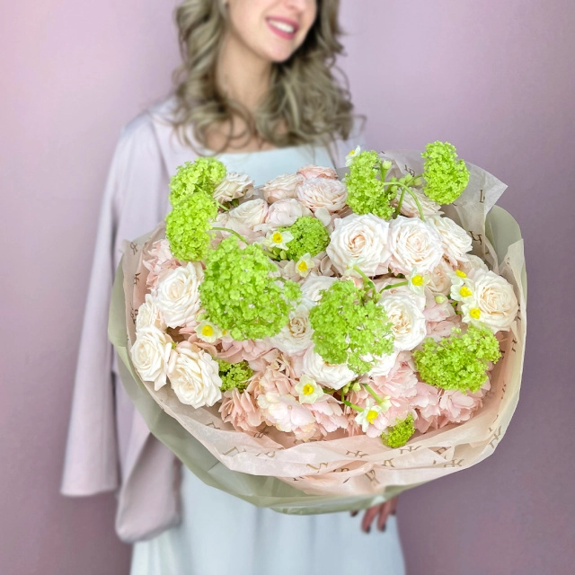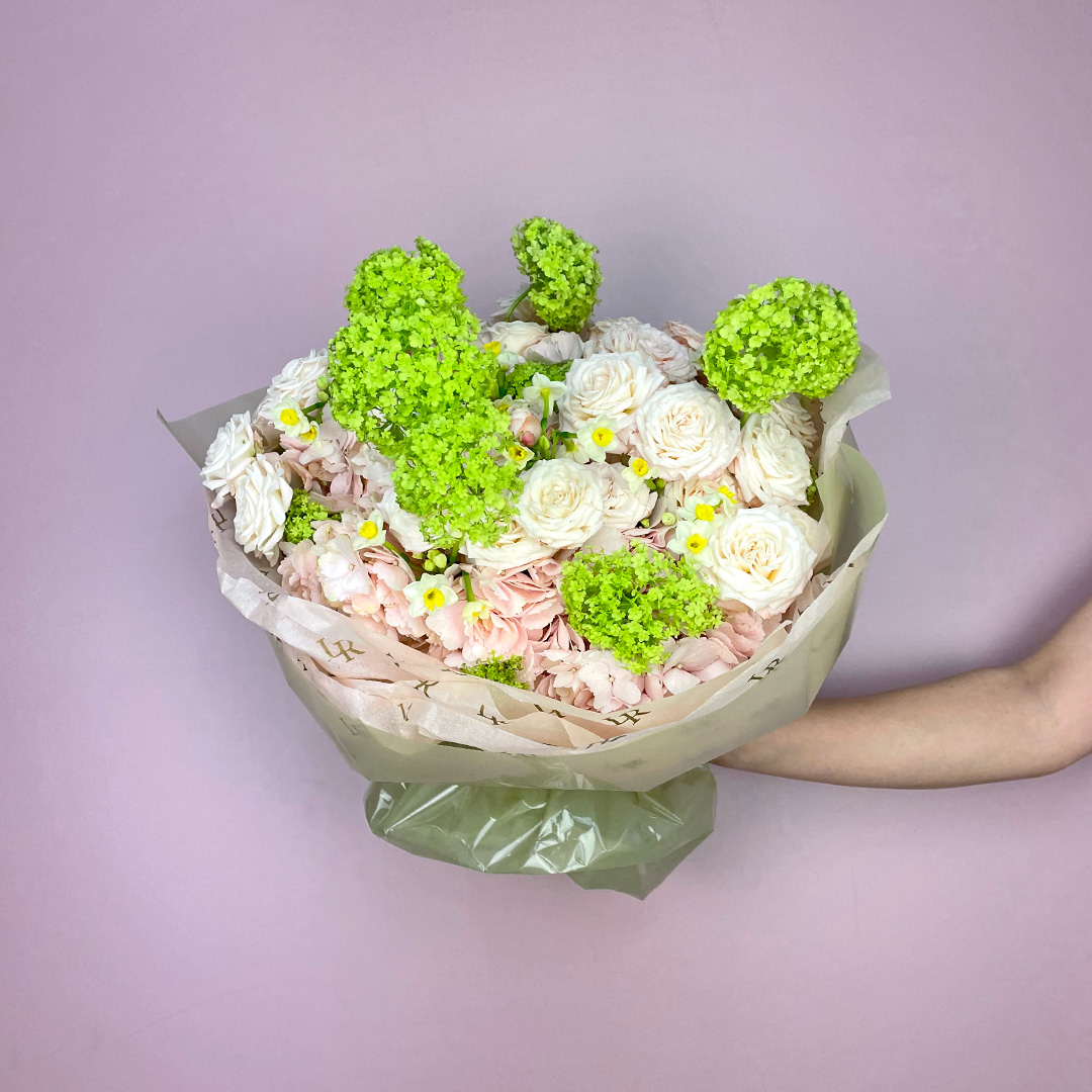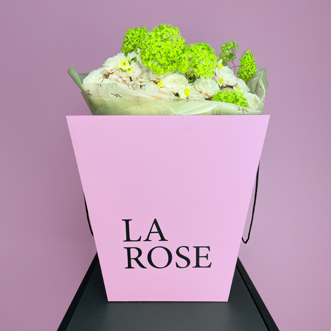 Роза кустовая, вибурнум, нарцисс, гортензия, бумага тишью La Rose, лента атласная La Rosе, пленка матовая. S - диаметр 30-35 см, высота =35-40 см M - диаметр = 35-40 см, высота = 35-40 см L - диаметр = 45-50 см, высота = 45-50 см