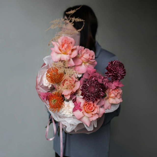 Некоторые цветы и материалы являются сезонными и могут быть недоступны в данный момент, поэтому мы оставляем за собой авторское право определять конечный состав букета.