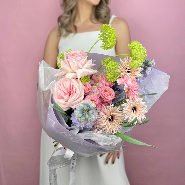 роза пионовидная одиночная, роза кустовая, гербера, вибурнум, дельфиниум, гвоздика Д=40-45см, В=50-55см.