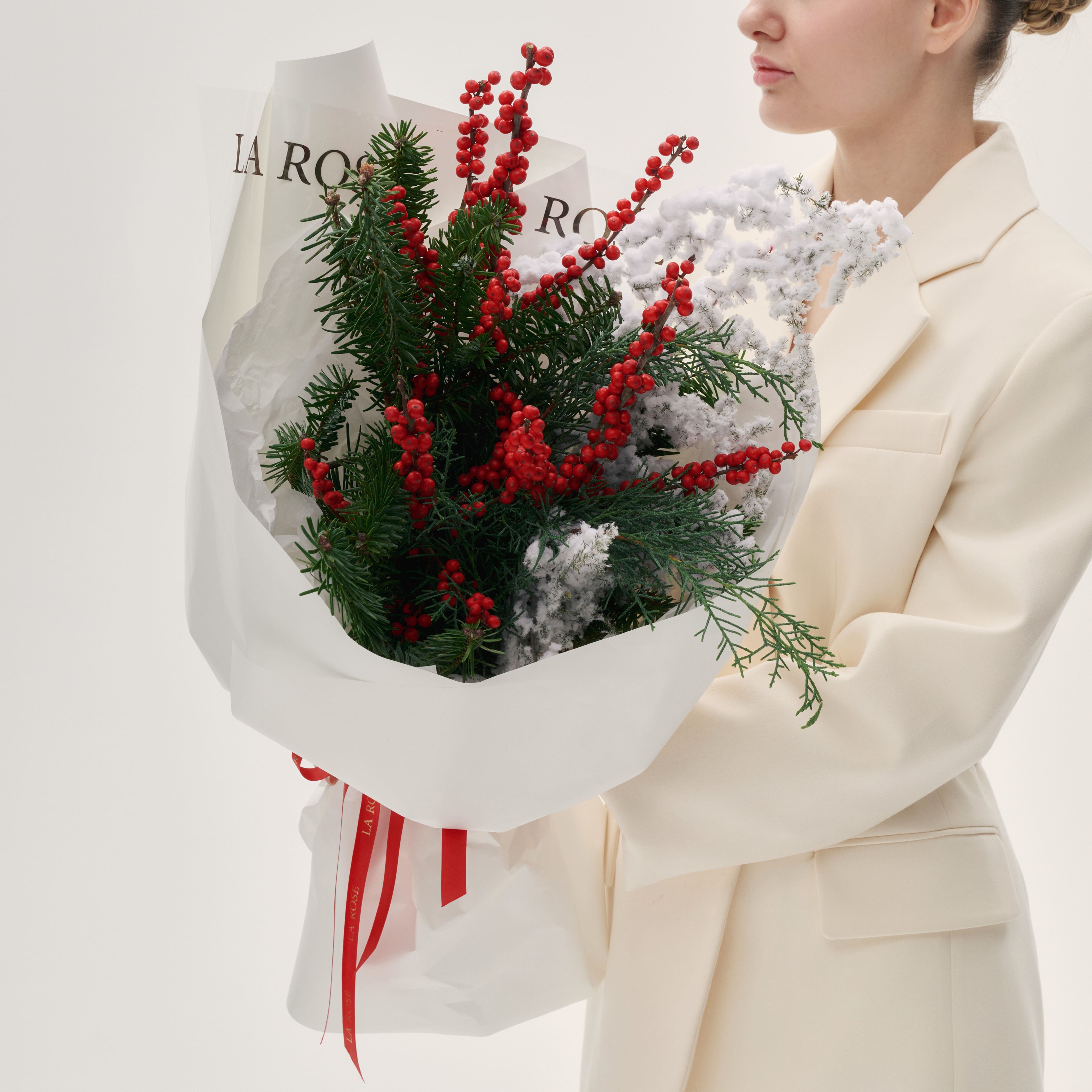 Новогодний букет с заснеженным аспарагусом и ягодами